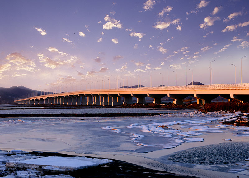 大橋工程分為主橋、預(yù)制段引橋和北側(cè)現(xiàn)澆段引橋,其中主橋長500米,主跨為120米的大跨變截面預(yù)應(yīng)力混凝土連續(xù)箱梁,是當(dāng)時(shí)東北地區(qū)跨度最大的連續(xù)梁跨海橋。大橋的設(shè)計(jì)結(jié)合了使用和景觀的雙重功能,作為普灣經(jīng)濟(jì)區(qū)核心位置的地標(biāo)性景觀,獨(dú)具特色的夜景設(shè)計(jì)使其成為經(jīng)濟(jì)區(qū)一道亮麗的風(fēng)景線。